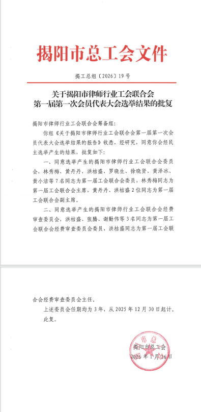 揭阳市律师行业工会联合会委员会委员、经审委员会委员名单公告