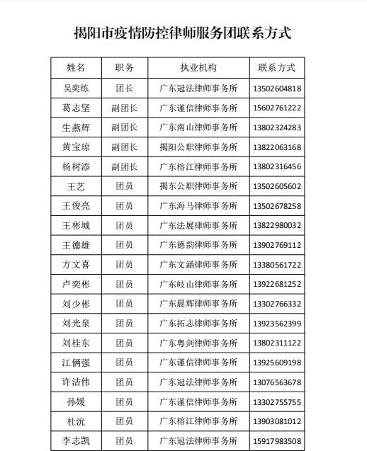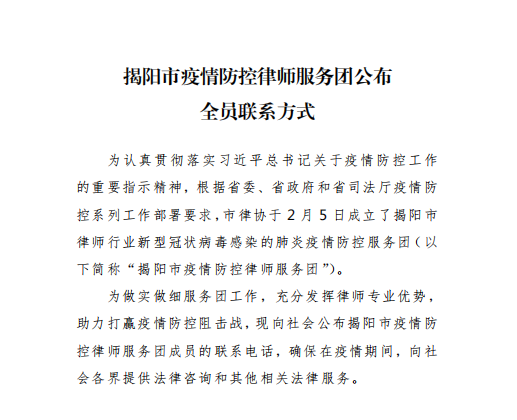 关于成立揭阳市律师行业新型冠状病毒感染的肺炎疫情防控服务团的通知